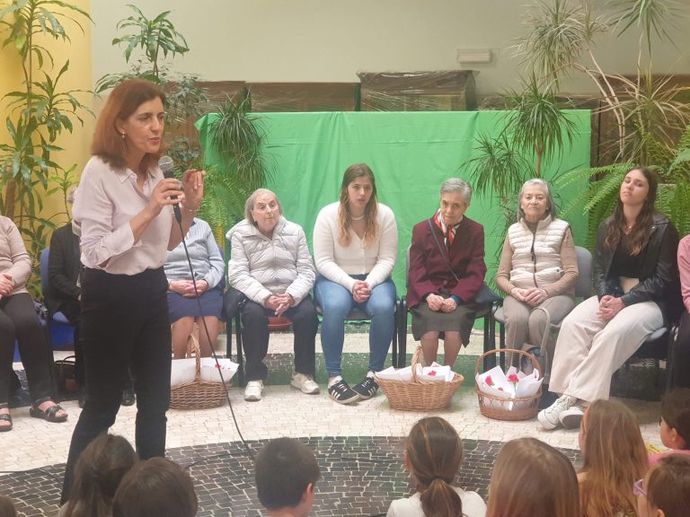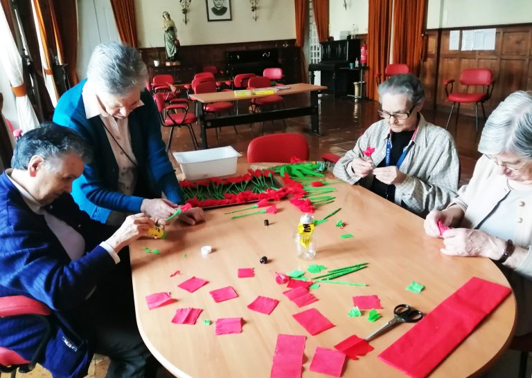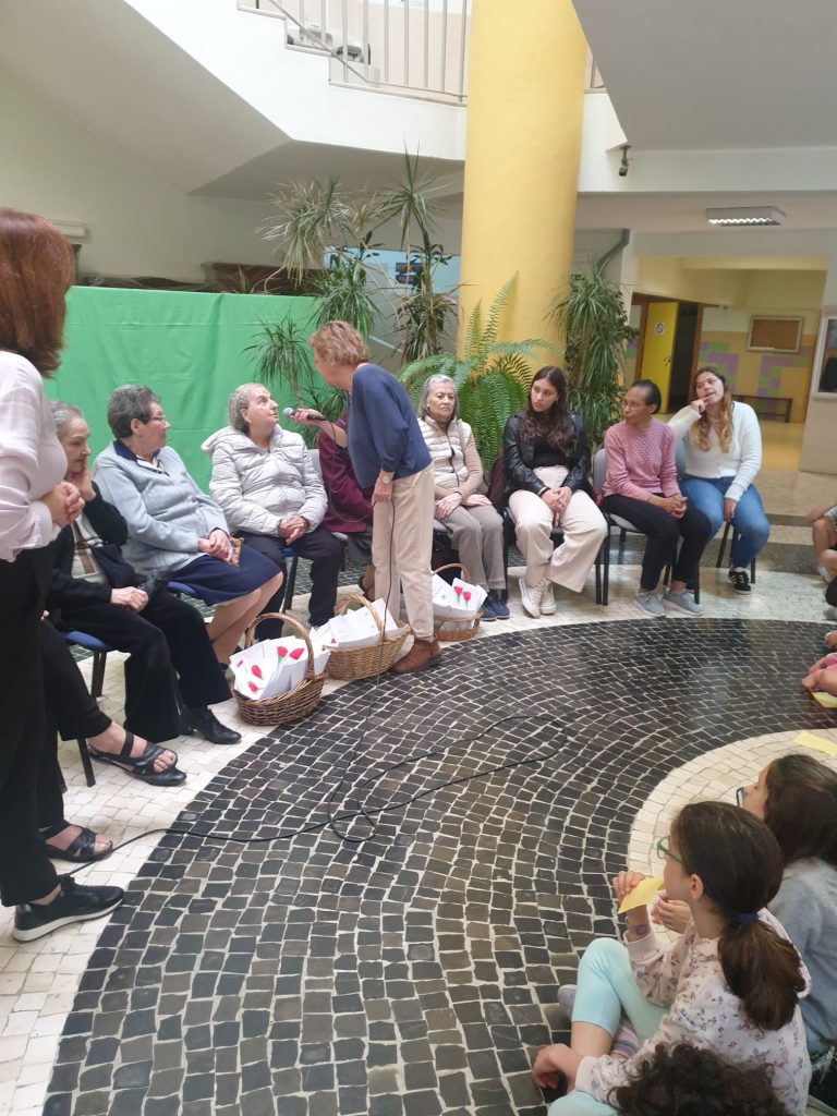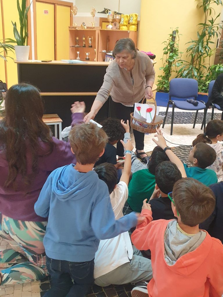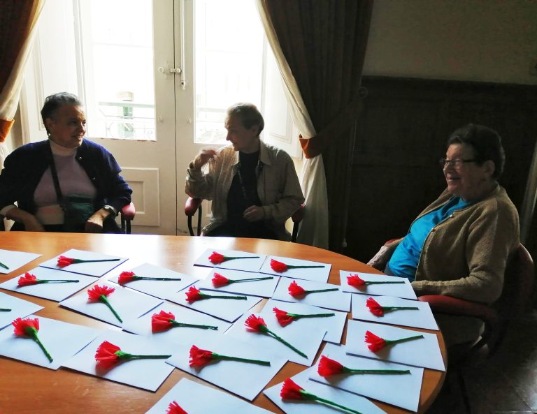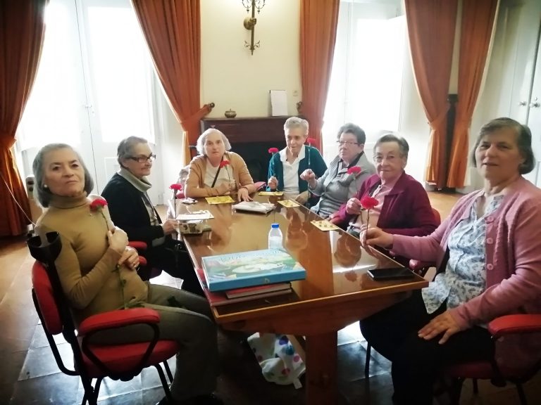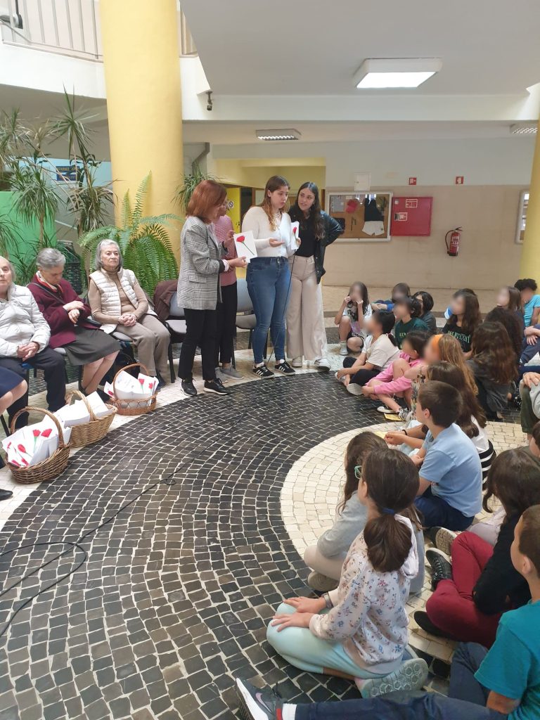 Aconteceu no passado dia 19 de abril e desta vez foram as Utentes que se deslocaram à Escola Ressano Garcia para contar aos mais jovens como se vivia antes do 25 de abril de 1974 e quais as mudanças que aconteceram na vida das pessoas, na sociedade portuguesa. Os alunos, quais pequenos jornalistas, foram fazendo perguntas: Alguma vez se sentiu discriminada por ser mulher? Que diferenças existem entre o estilo de vida das mulheres durante o Estado Novo e das mulheres no momento presente? Qual foi grande mudança desde então, no que diz respeito aos direitos das mulheres? Como era a sua casa?… Estas e outras questões foram sendo respondidas, uma a uma, para que nada ficasse por saber. Após esse diálogo as Idosas ofereceram a cada aluno uma lembrança simbólica – um cravo vermelho – construído pelas mesmas.