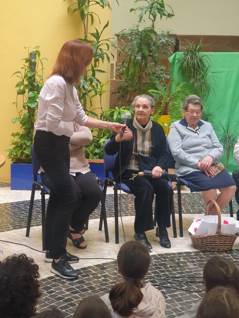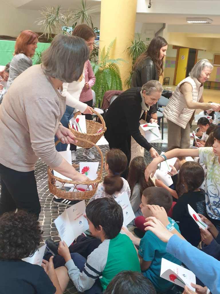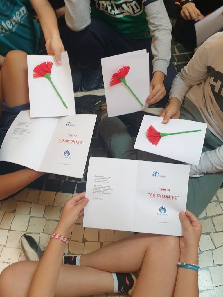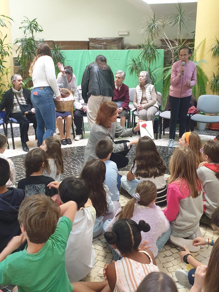 As crianças já sabiam a história dos cravos da D. Celeste, que passaram a ser a marca de uma Revolução que há cinquenta anos trouxe a Liberdade e a Democracia a Portugal e aos Portugueses. Foi muito bom! As Idosas agradecem o caloroso acolhimento da Direção da Escola, a todo o corpo Docente e não-Docente e aos alunos do 4º ano das três Turmas. E claro, à Associação Resgate, que continua a promover estas iniciativas intergeracionais. Muito obrigada por terem proporcionado mais um momento inesquecível.