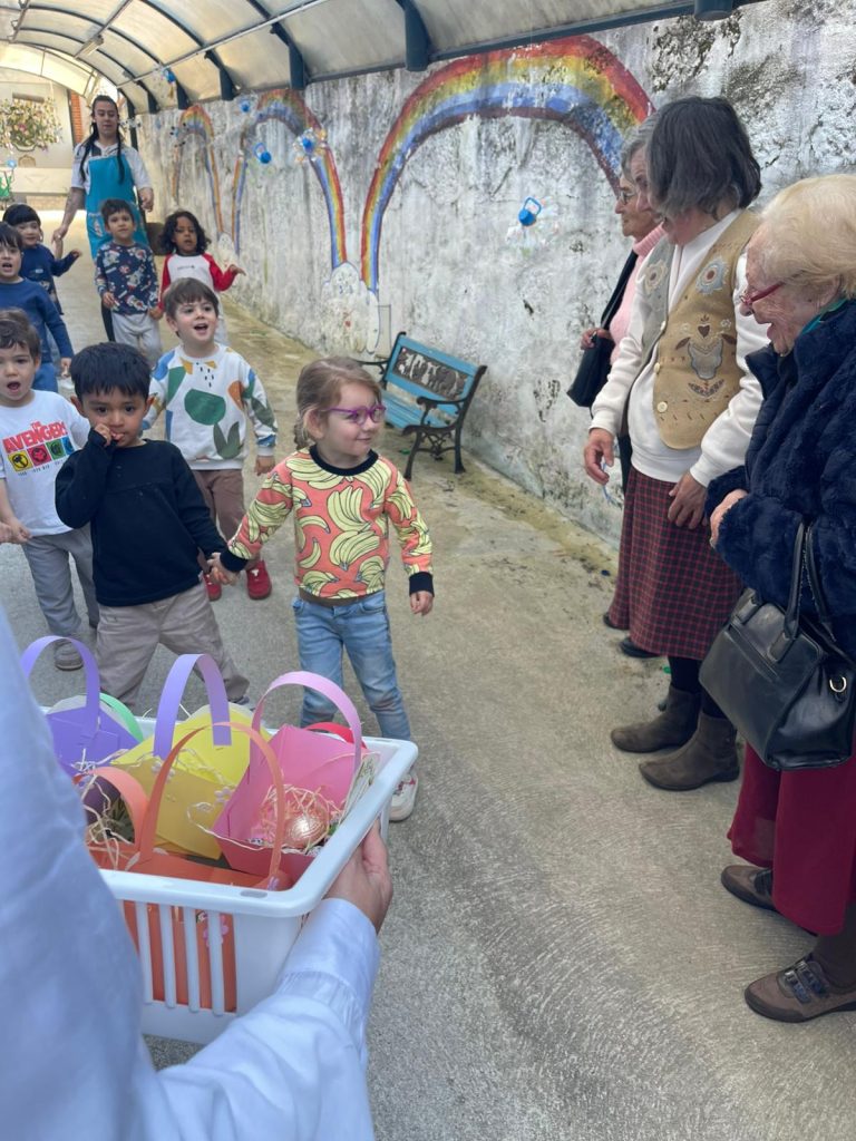 Estas cestinhas foram realizadas para levar as amêndoas e uma mensagem de Feliz Páscoa. Símbolo feito com amor, dedicação e reconhecimento por todos os que cruzam a missão desta Instituição. Este gesto, concretizado pelos utentes do Centro de Dia e do Lar, chegou até aos utentes e suas famílias do Serviço de Apoio ao Domicílio, Centro de Dia e Lar. Chegaram também às crianças da creche “O Coelhinho”, que tem vindo, com frequência, a desenvolver atividades com os utentes, bem como aos vizinhos e outras pessoas. Assim, pudemos distribuir dedicação e carinho, pois a realização desta atividade foi um momento de alegria, de partilha de histórias e de valorização pessoal, despertando memórias e reforçando laços afetivos.
